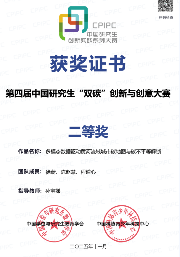 建筑与城乡规划学院获奖作品《多模态数据驱动黄河流域城市碳地图与碳不平等解锁》,聚焦黄河流域特大城市,通过多模态数据构建高精度碳地图,解析碳排放与社会经济之间的内在关联,实现“碳地图”与“碳不平等”政策解锁。旨在制定一份兼顾碳公平与碳中和的特大城市最优脱碳路径,为其他特大城市碳减排提供参考,促进黄河流域低碳发展,从而高质量、公平实现“3060”“双碳”目标。作品在服务国家“双碳”战略、探索高质量可持续发展路径上的重要价值,赢得了评审专家的一致认可,最终荣获全国二等奖。