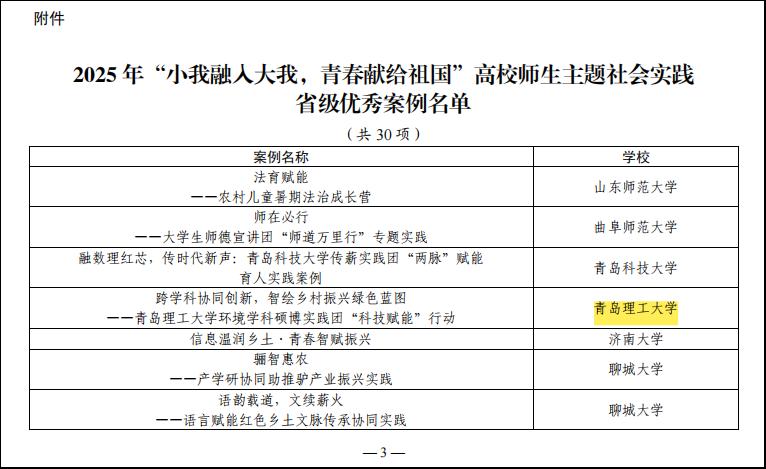 近日,山东省教育厅公布了2025年“小我融入大我,青春献给祖国”高校师生主题社会实践省级优秀案例名单。环境与市政工程学院申报的“跨学科协同创新,智绘乡村振兴绿色蓝图——青岛理工大学环境学科硕博实践团‘科技赋能’行动”入选,成为全省30项优秀案例之一,展现了学院在社会实践育人方面的扎实成效与创新活力。