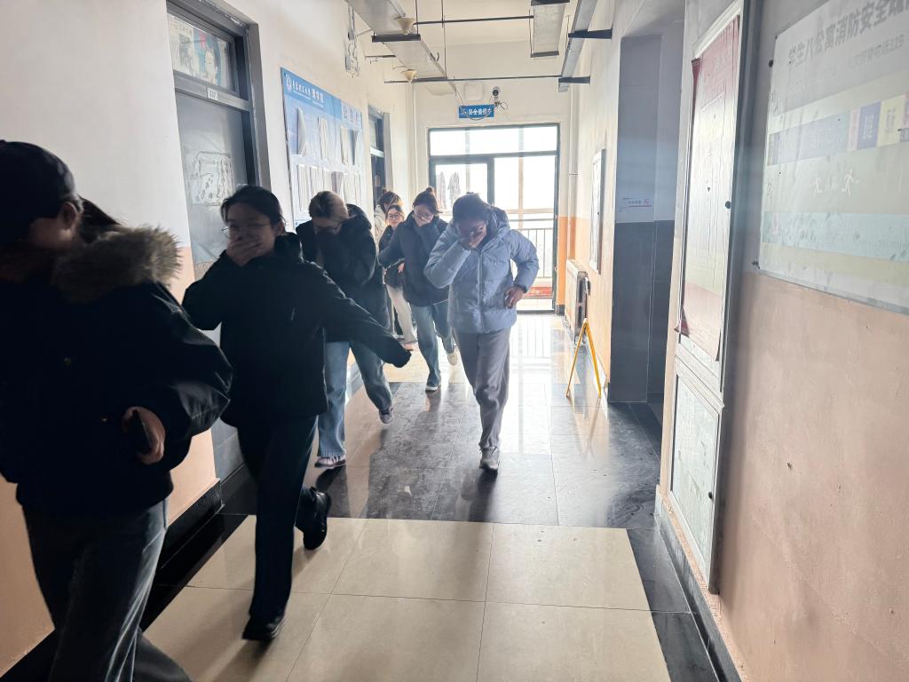 15时,消防警报响起,演练正式开始。工作人员在一楼释放烟雾弹,模拟真实火场环境。楼管人员迅速打开逃生通道,各楼层引导老师即刻就位指挥,学生严格按照要求排成两路纵队,沿楼梯两侧低头弯腰撤离。大家用湿毛巾捂住口鼻,一手扶墙或扶扶手,前后保持安全距离,慢跑前行。整个撤离过程快速有序,全体学生在数分钟内安全集结完毕,无一人遗漏。