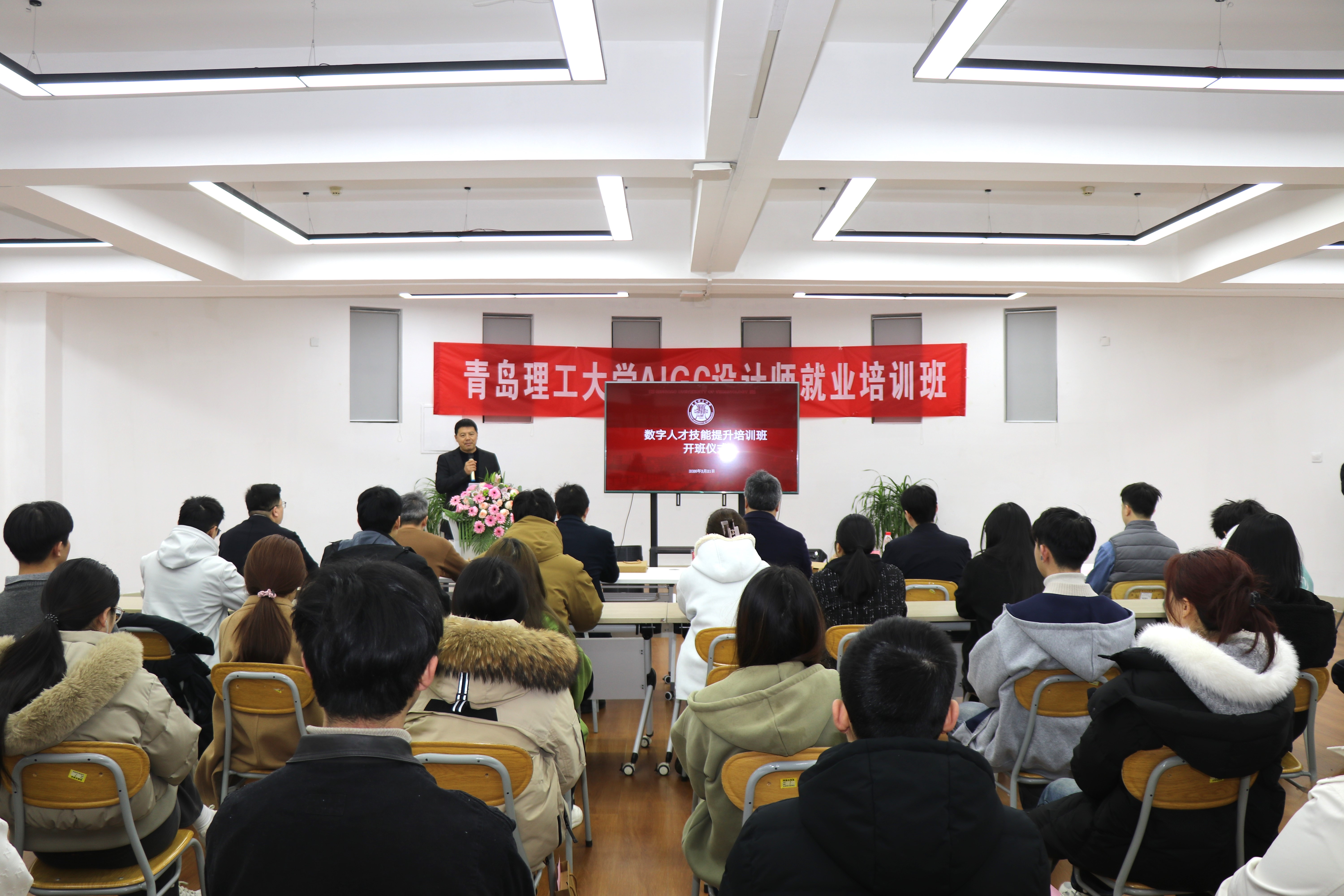 仪式上,合作企业代表、青岛智圣未来智能科技有限公司总经理陈圣田介绍了培训班的筹备背景与意义。他表示,本次培训班旨在搭建一个“高校—企业—行业”深度联动的学习与实践平台,精准对接产业需求,帮助学员系统提升数字建模、数据分析、智能技术应用等前沿技能,为区域经济社会发展注入新动能。青岛曦今文化传媒有限公司总经理郑志结合行业实践,分析了当前数字内容创作、传播领域的人才需求变化。他指出,数字技术正在重塑各行各业,不仅需要专精技术的“工程师”,更需要懂技术、善管理、能创新的“跨界人才”,鼓励学员把握学习机会,主动构建跨学科知识体系,成为推动产业数字化转型的中坚力量。