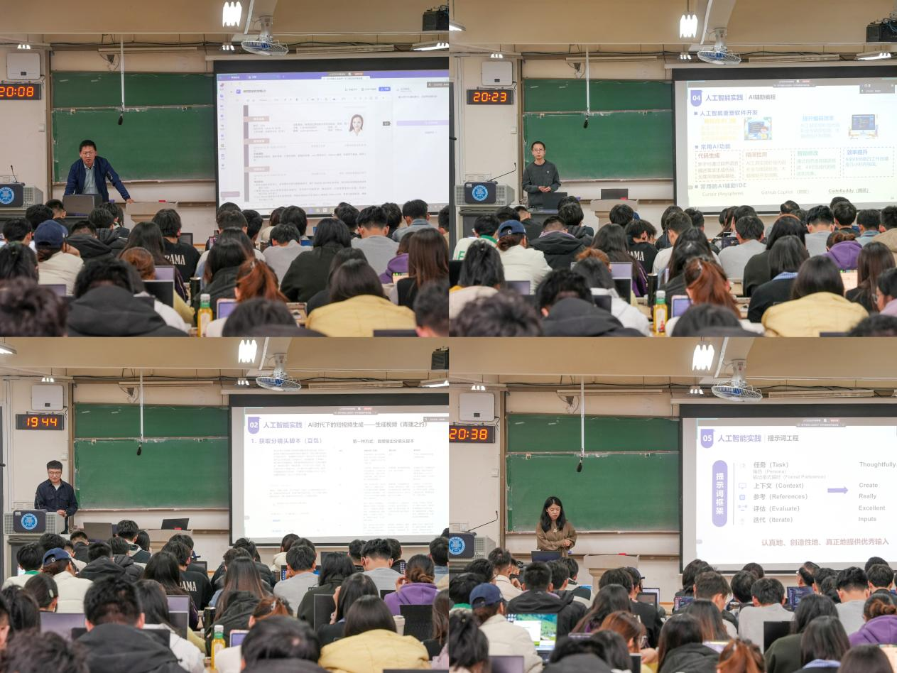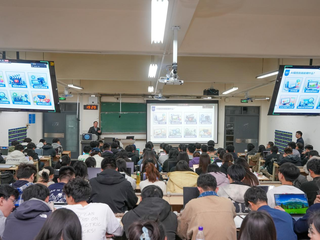 “人工智能正在改变就业市场与职业发展模式,我们不该做被动的参与者,而要成为主动的践行者。”课堂上,王雷结合自身科研与工作经历,深刻剖析人工智能时代就业市场的新特征、新趋势,阐释人工智能对各行业初级岗位的重构作用,让同学们清晰地认识到掌握AI技术的重要性与战略优势。他详细介绍了人工智能在各类就业场景中的多元应用,鼓励同学们主动学习、熟练运用AI工具,将其转化为提升工作效率、增强就业竞争力的重要抓手。信息管理学院副院长宋传旺以“AI是什么”“AI能做什么”“我们该怎么做”为脉络,由浅入深讲解人工智能对生活与工作方式的深刻影响,为后续课程内容的开展做好扎实铺垫。学院教师团队从AI生成视频、AI就业助手、AI辅助编程、AI提示词工程四大维度,通过现场演示、案例讲解的方式,全面展示人工智能的技术能力与广泛应用场景。