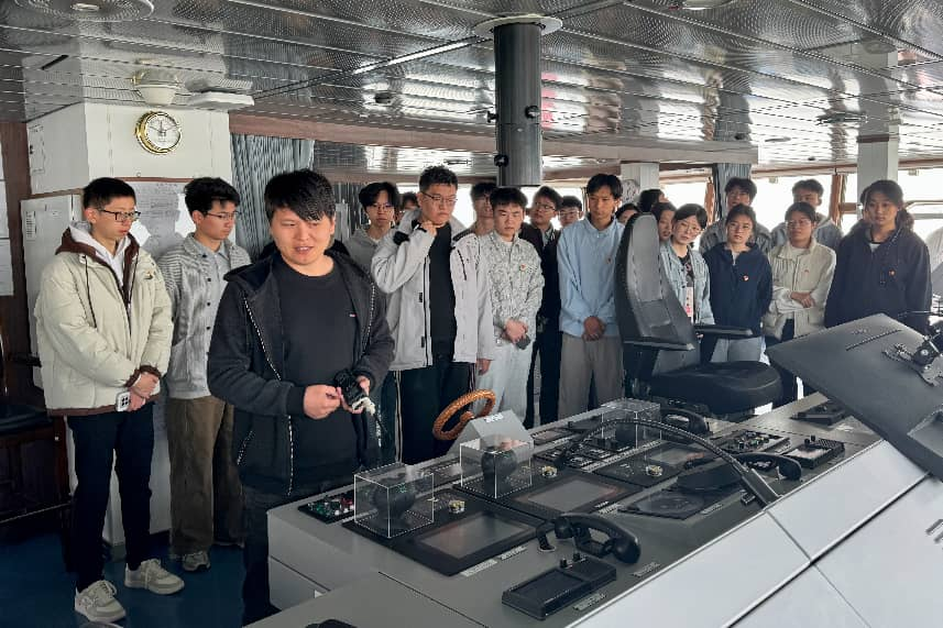 在北海研究站工作人员的引导下,师生党员登上“极地号”与“大洋一号”,零距离参观了驾驶舱、实验控制室、轮机、甲板机械等关键设备,了解科考船的装备配置与科研能力,沉浸式感受我国在极地海洋装备领域的顶尖水平。