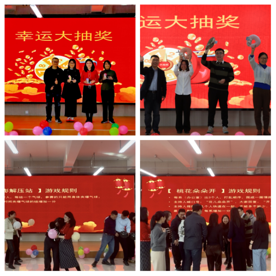 游戏环节更是欢乐值满满,“桃花朵朵开”让大家在抱团互动中增进默契,“解压砰砰站”帮老师们释放压力、畅享轻松,欢呼声与笑声此起彼伏。活动尾声,全体教职工共同唱响《相亲相爱一家人》,温馨的旋律萦绕全场,为文艺汇演画上圆满句号。