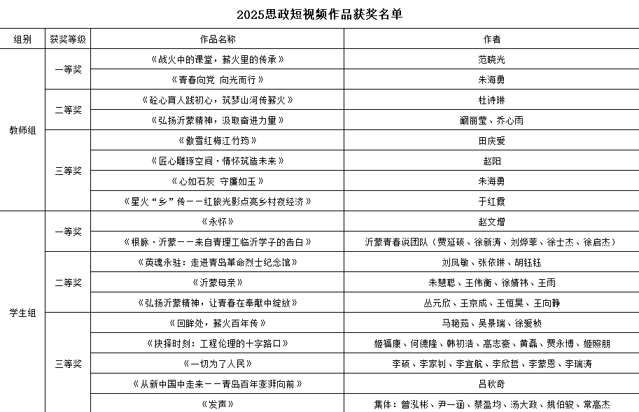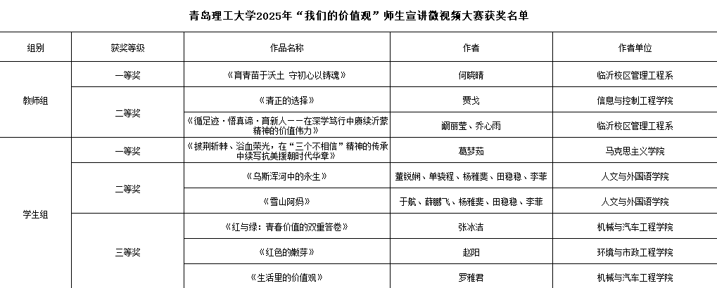 根据《关于在全校开展“我们的价值观”师生宣讲微视频大赛的通知》及《关于组织开展2025年思政短视频征集活动的通知》,宣传部高度重视、精心组织,会同相关部门组织评审,形成获奖人员名单,名单如下。
